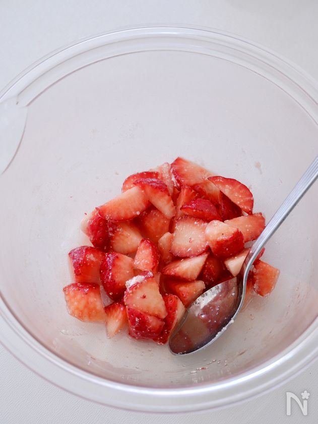 (下準備) ・いちごを洗ってヘタを取り、食べやすい大きさに切る。砂糖(いちご用)をまぶしてさっと混ぜ、1時間ほど置いておく。