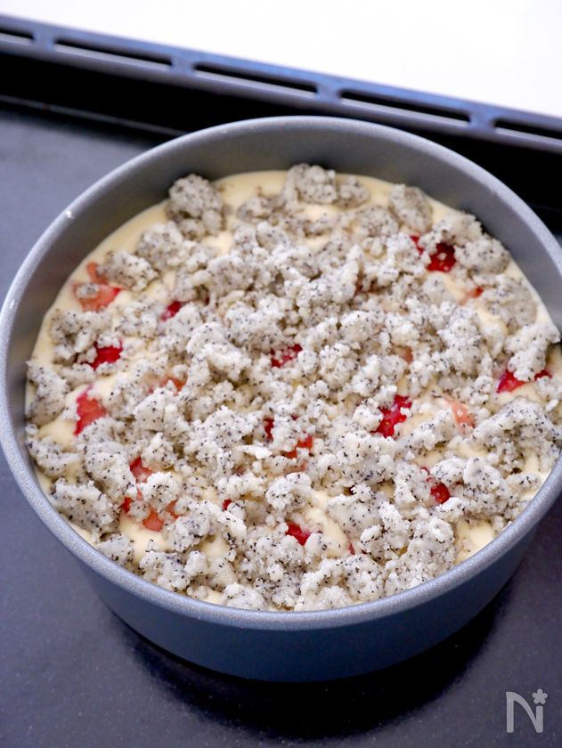 (5) 型に生地を入れ、いちごを全体にそっと乗せる。さらに上からクランブルを手でパラパラにしながらまんべんなく乗せる。