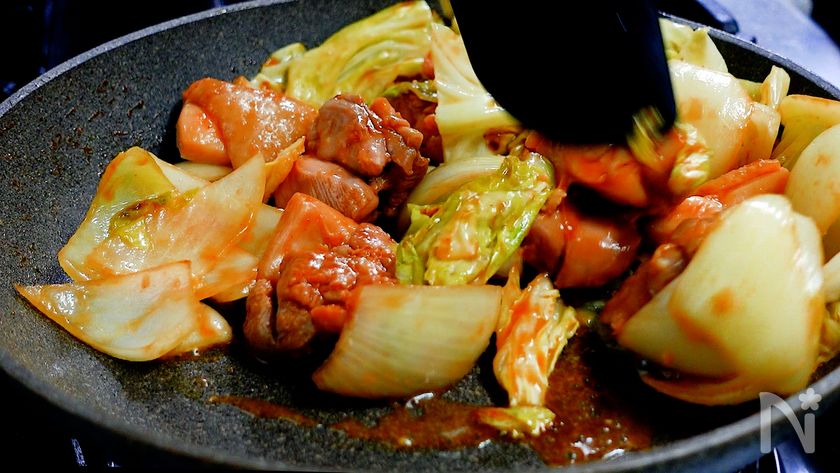 (7) 3分後、サッと混ぜもう一度蓋をして3分蒸し焼きにする。
