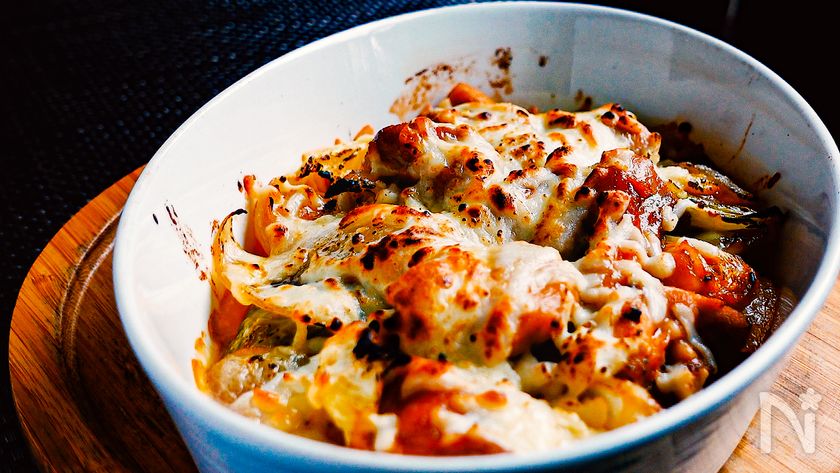 (9) 耐熱皿に移しミックスチーズをのせ、200℃に予熱したオーブンで10分焼く。
