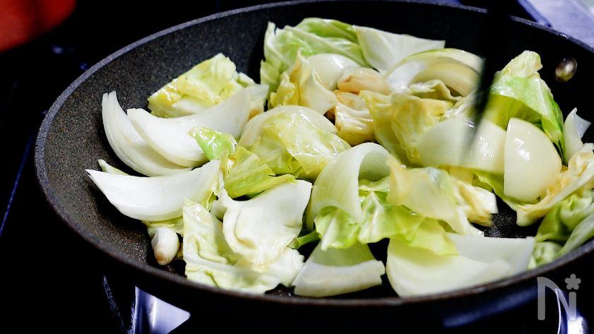 (4) フライパンにごま油をひき中火にかける。温まったらキャベツ、玉ねぎを加え炒める。油が全体に回ったら塩をし、しんなりするまで炒める。