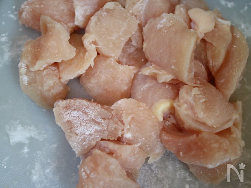 (2) 鶏むね肉はひと口大に切り、塩を振り、米粉をまぶす。