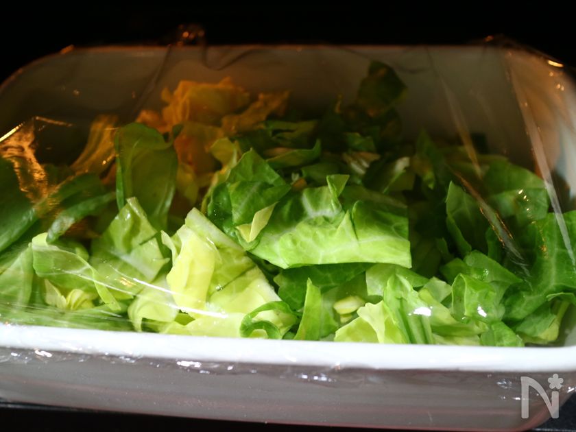 (1) キャベツはざく切りにし、耐熱容器に入れ、ふんわりとラップをし600Wのレンジで3分加熱する。