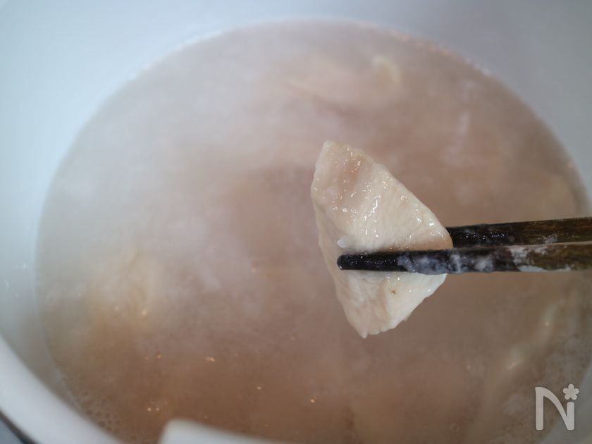 (3) 用意しておいたお湯で鶏むね肉を火が通るまでゆでる。