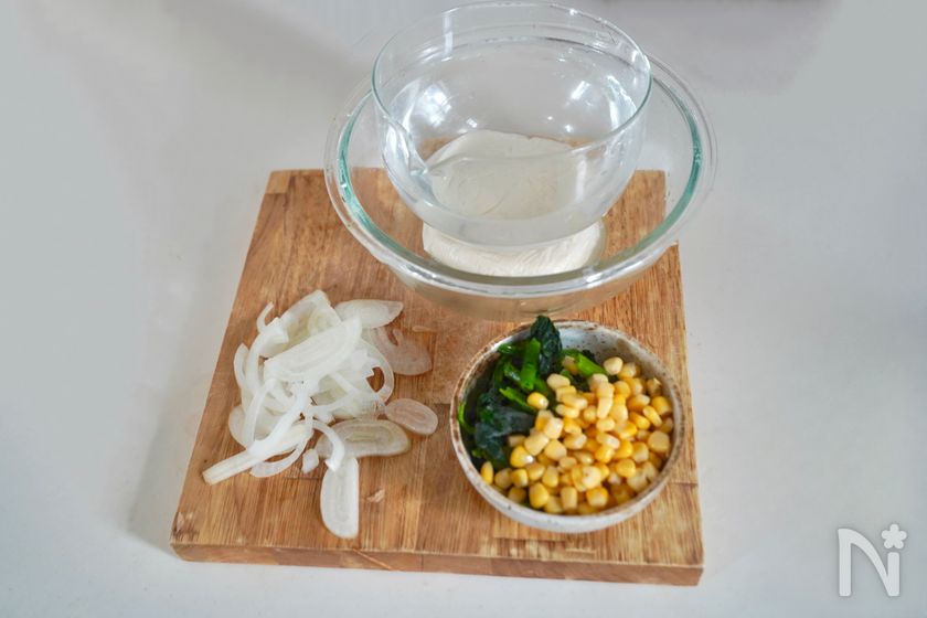 (3) ②の上に玉ねぎをのせ、【B】とバター(5g)を加える。ラップし電子レンジ(600W)で4分加熱。