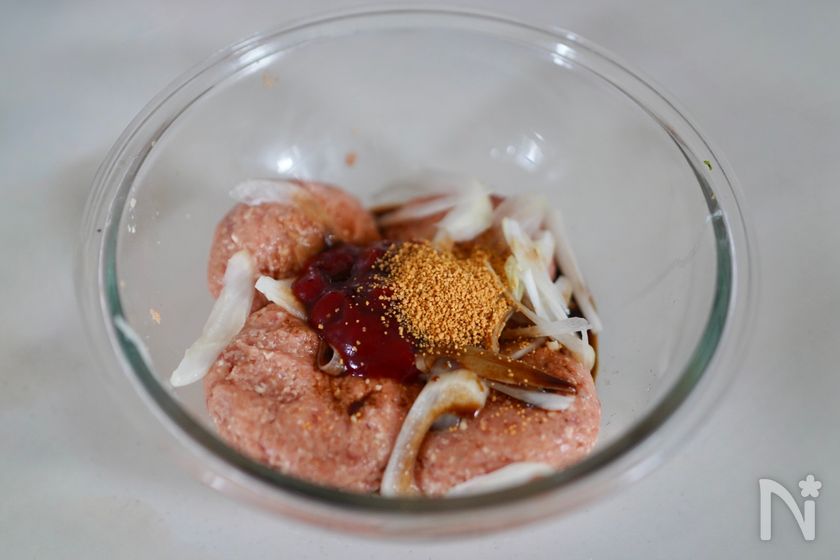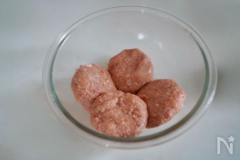 (2) ボウルに合いびき肉と水切りをした絹豆腐、【A】を加えて混ぜ、4等分に成形。