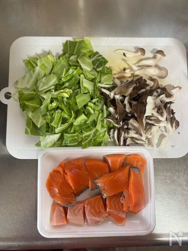 (1) キャベツはざく切りする。きのこ(しめじ、舞茸など)は石づきをとってほぐす。生鮭は骨があれば取り、ひとくち大に切る。
