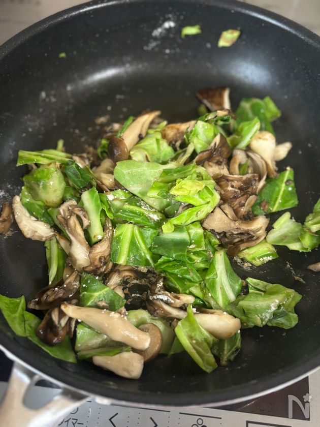 (3) 鮭をいったん取り出し、余計な油を拭き取ったら、同じフライパンできのこ、キャベツをしんなりするまで炒める。小麦粉を加えて炒め合わせる。