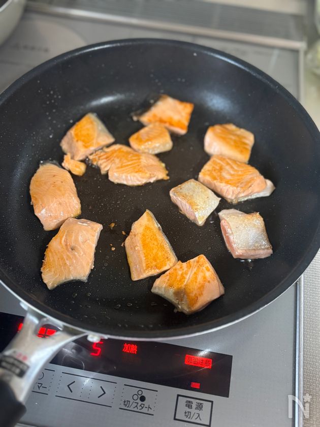 (2) フライパンにサラダ油をひき、鮭を両面こんがり焼き色がつくまで焼く。