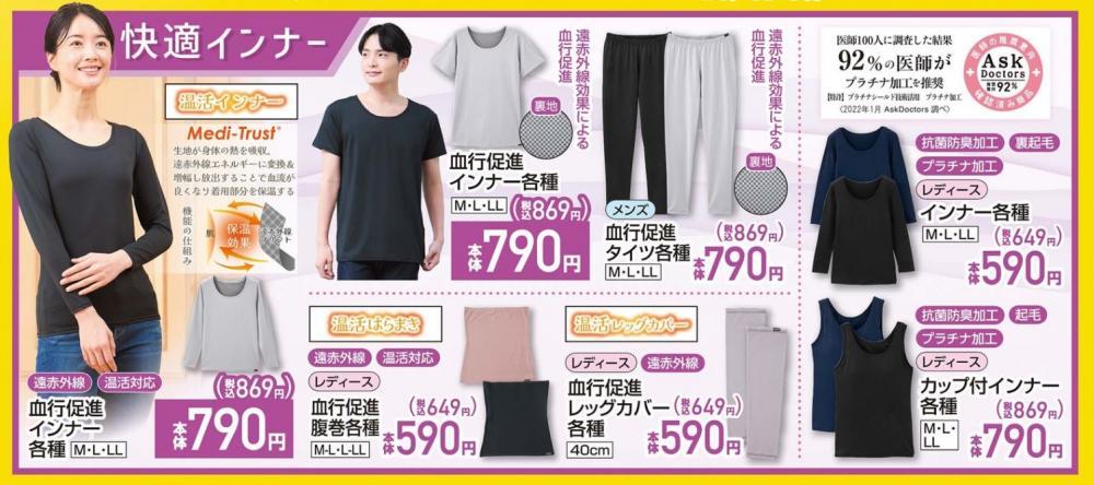 遠赤外線プリントで血行促進と保温の効果が期待できる温活インナー「Medi-Trust」からは、「血行促進インナー各種」(869円)や「血行促進腹巻各種」(649円)、「血行促進レッグカバー」などが登場。カイロを使わずに、身体のあらゆるパーツを優しく温めることができます。