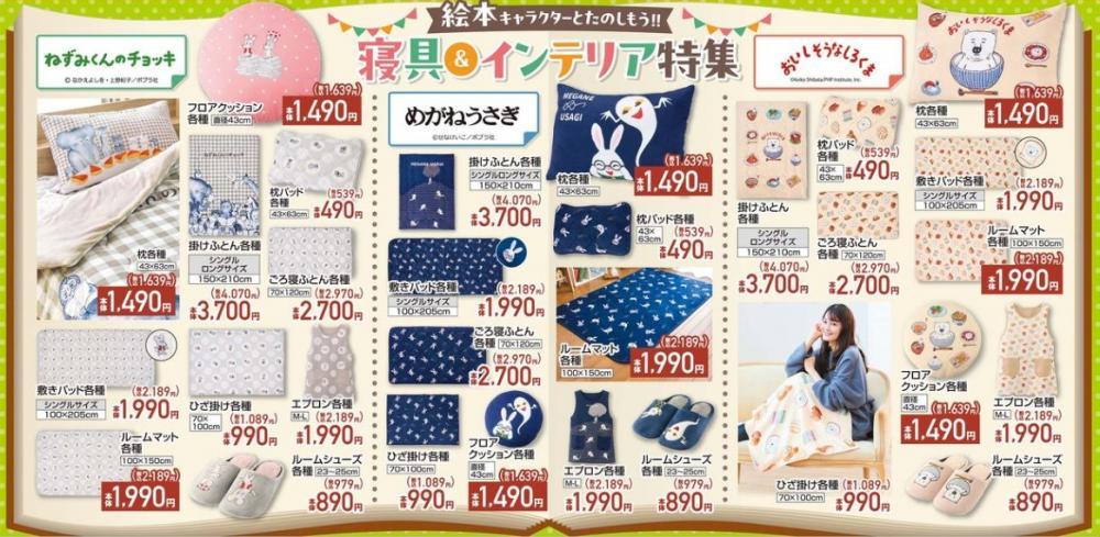 さらに、期間中は「寝具&インテリア特集」も実施。「ねずみくんのチョッキ」「めがねうさぎ」「おいしそうなしろくま」といった、名作絵本のイラストをプリントした、子ども心くすぐるアイテムがズラリと並びます。