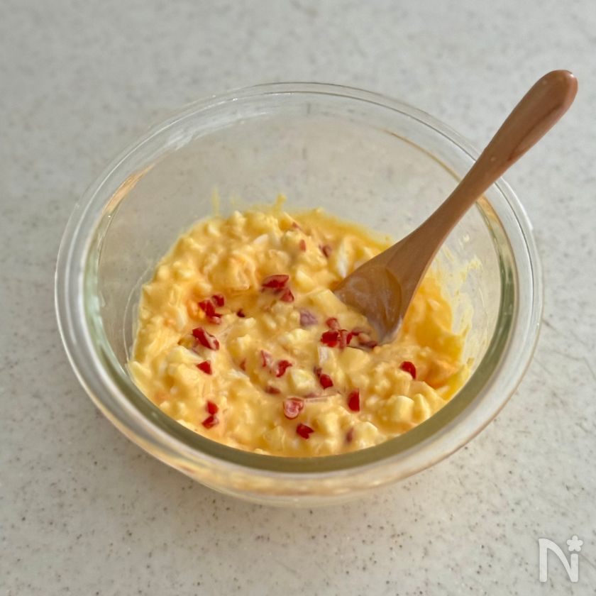 (2) ゆで卵をつぶし【A】を混ぜ合わせて、タルタルソースを作る。
