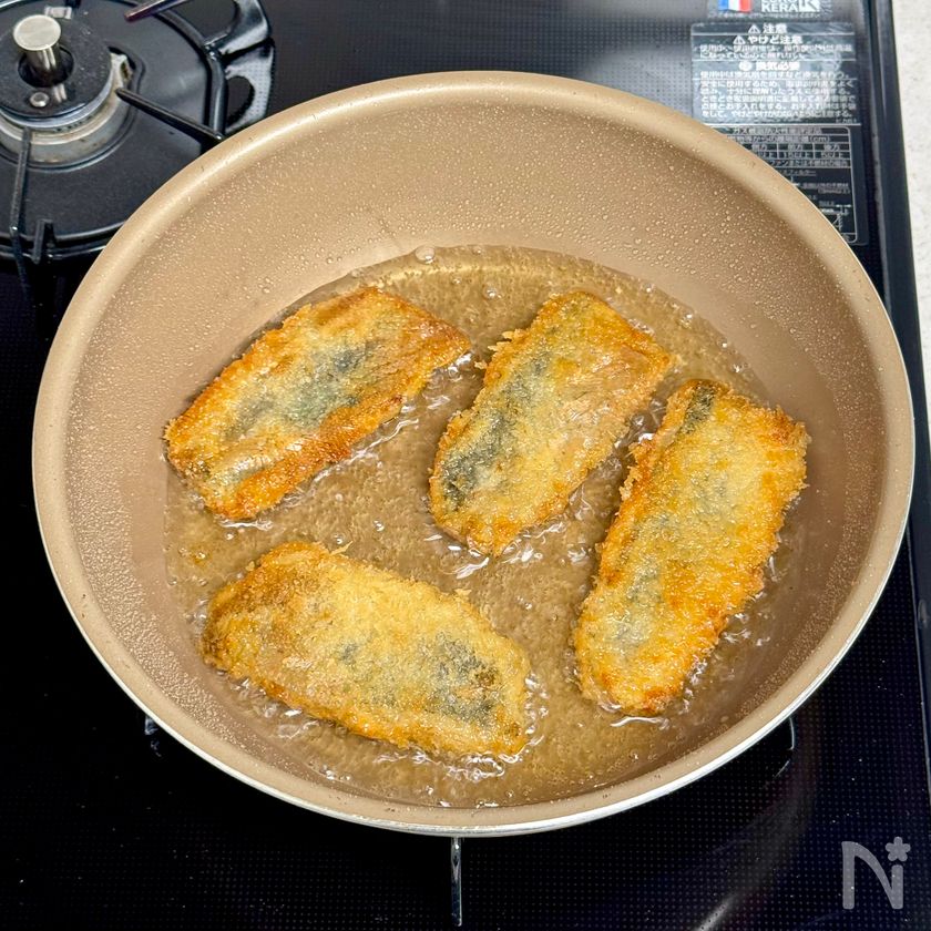 (4) フライパンに5mmほどサラダ油を入れて熱し、両面こんがりと揚げる。