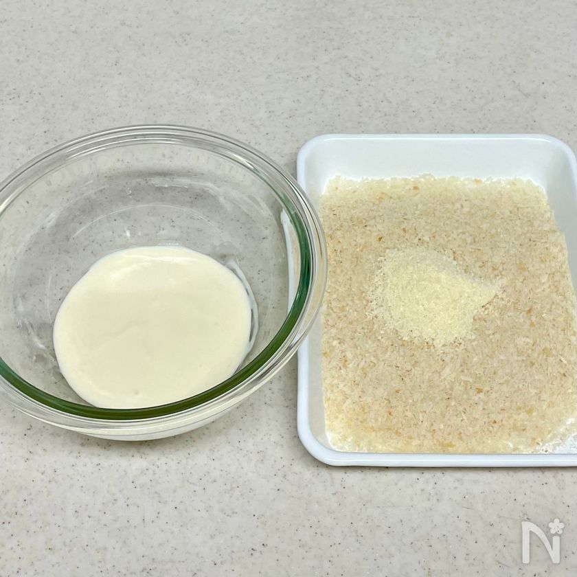 (3) 【B】を混ぜ合わせてバッター液を作る。パン粉に粉チーズを混ぜ合わせる。鯵をバッター液にくぐらせ、パン粉をつける。
