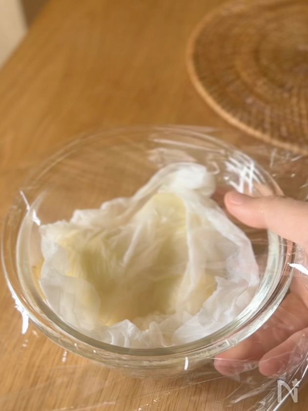 (1) 新じゃがは皮を剥いて、耐熱容器に入れ、濡らしたキッチンペーパーをかけ、ラップをふんわりして600W8分レンチンする。