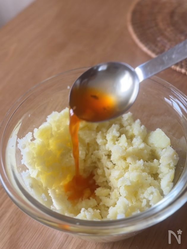 (4) じゃがいもは熱いうちに潰して、福神漬けの汁を混ぜておく。