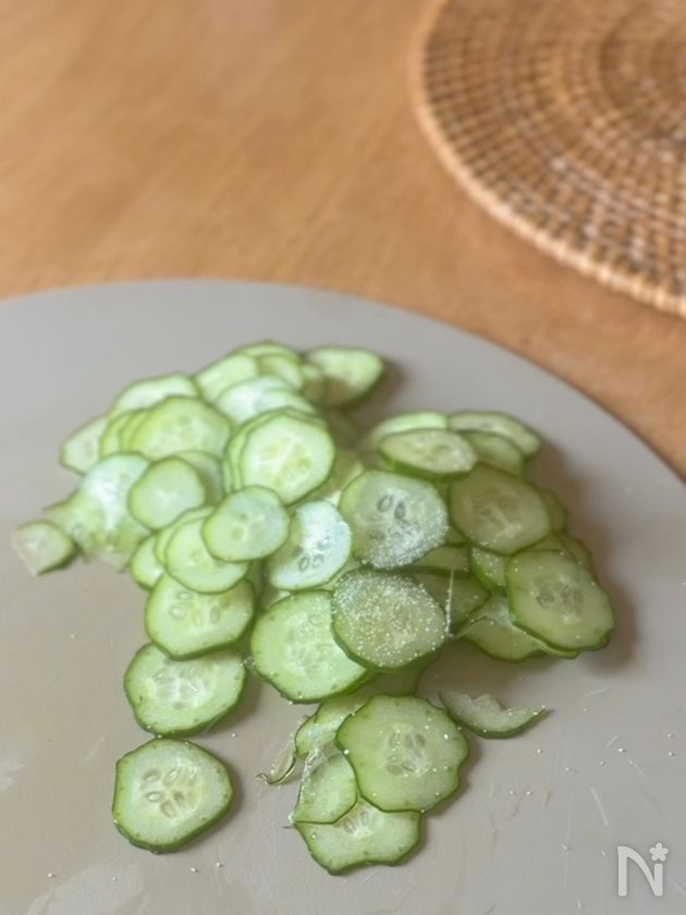 (2) 待っている間にきゅうりは輪切りにして、塩少々(分量外)を振って水気を取る。