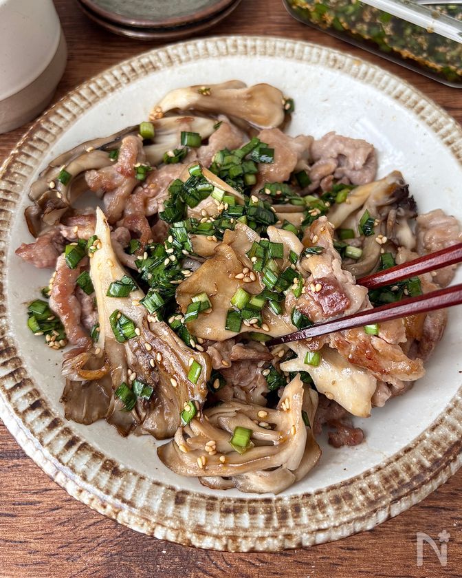 【豚こまと舞茸の旨辛ニラだれがけ】絶品ニラだれ!