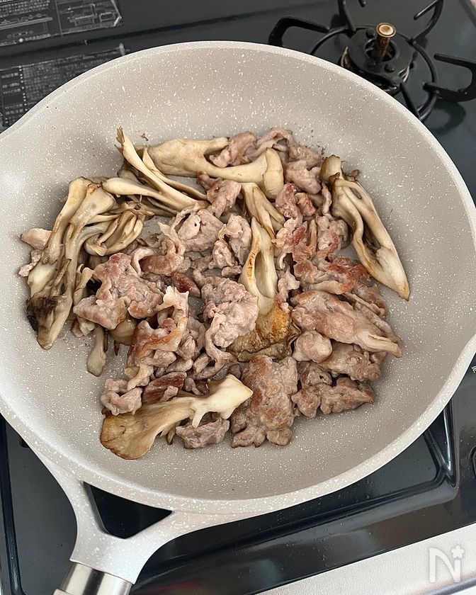 (3) フライパンにサラダ油を中火で熱し、豚こま切れ肉と舞茸を火が通るまで炒める。