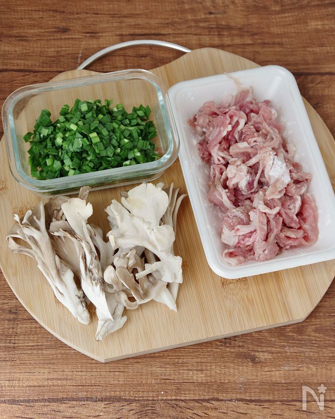 (1) 豚こま切れ肉は塩こしょうを振り、片栗粉をまぶす。舞茸は食べやすい大きさにほぐす。ニラは5mm幅に切る。