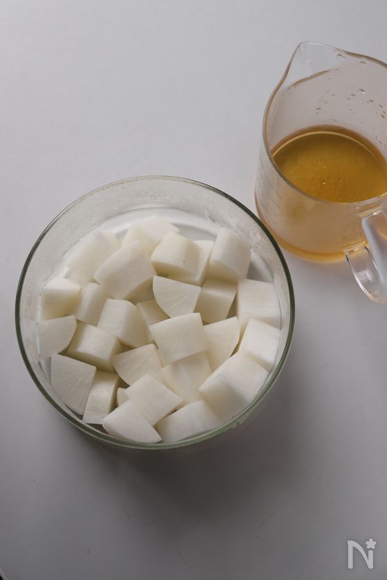 大根は先にレンジで加熱することで、味を染み込みやすくしています。