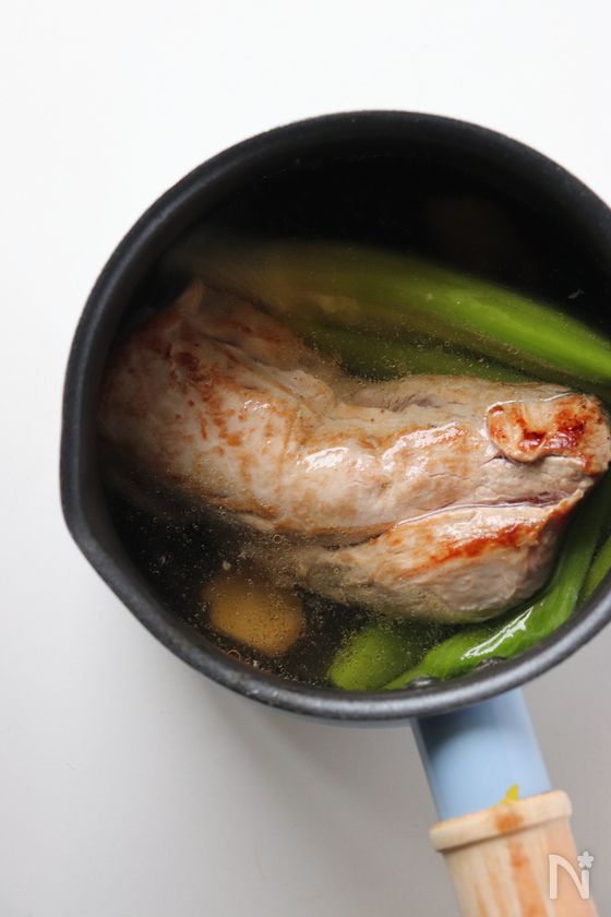 (3) 鍋に豚肉ブロック、ネギ(青い部分)、しょうが、水を加えて蓋をして8分中火で煮込む。