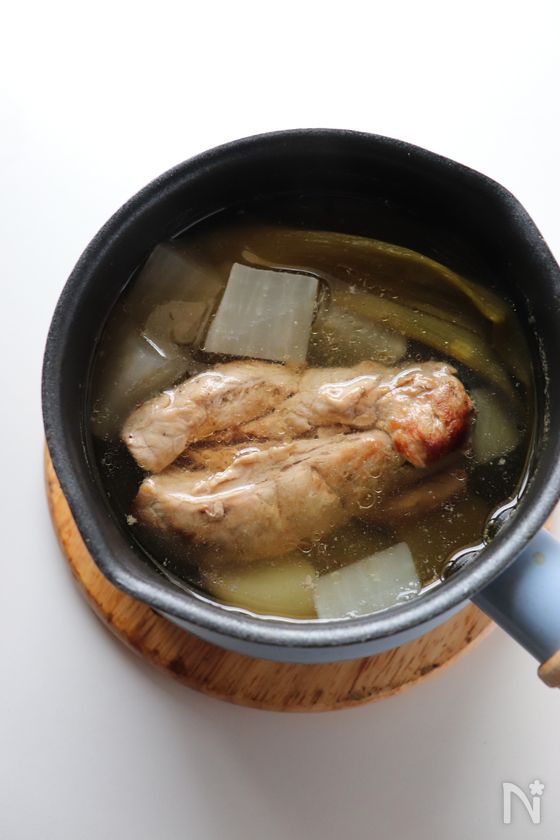 (4) アクを取り除き、大根と【A】を加えて蓋をして弱火で40分~1時間程煮込む。