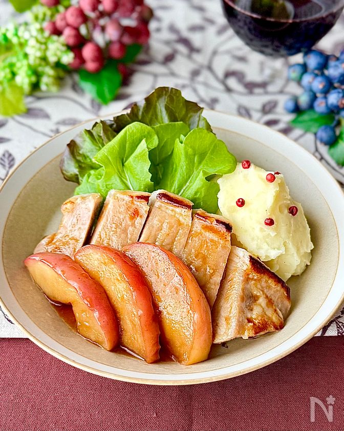 塩麹漬け豚肉のソテー・焼きりんごとマッシュポテト添え