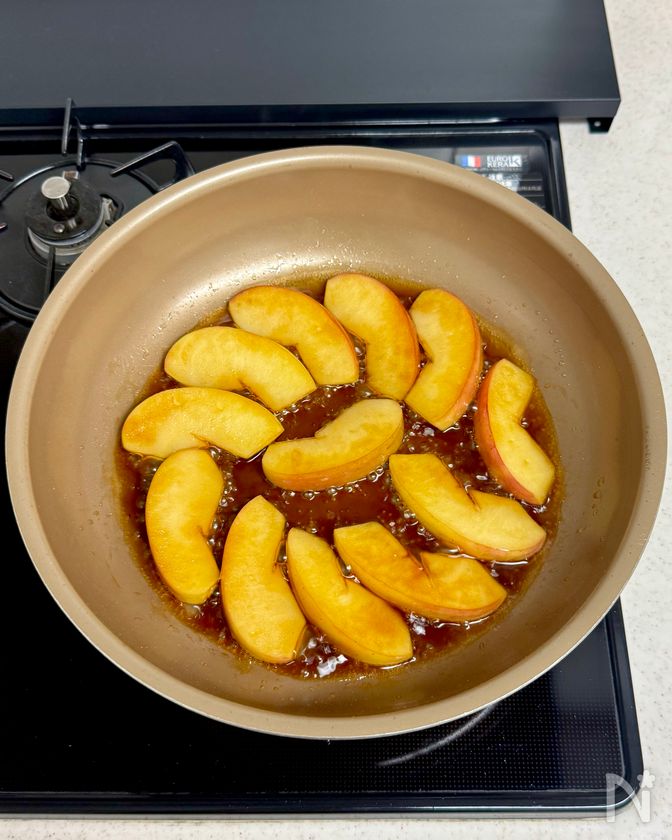 ・ソースは弱めの中火で短時間煮詰めると、照りよく仕上がります。調味料を加えた後は、りんごはあまり触らず、片面ずつ軽く絡める程度で◎