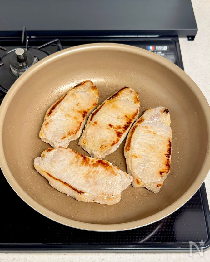 (3) フライパンにサラダ油を中火で熱し、塩麹を軽く拭き取った豚肉を並べて両面こんがり焼き、中まで火を通す。