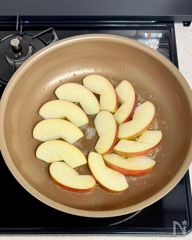 りんごを並べて、両面焼き色がつくまで焼く。