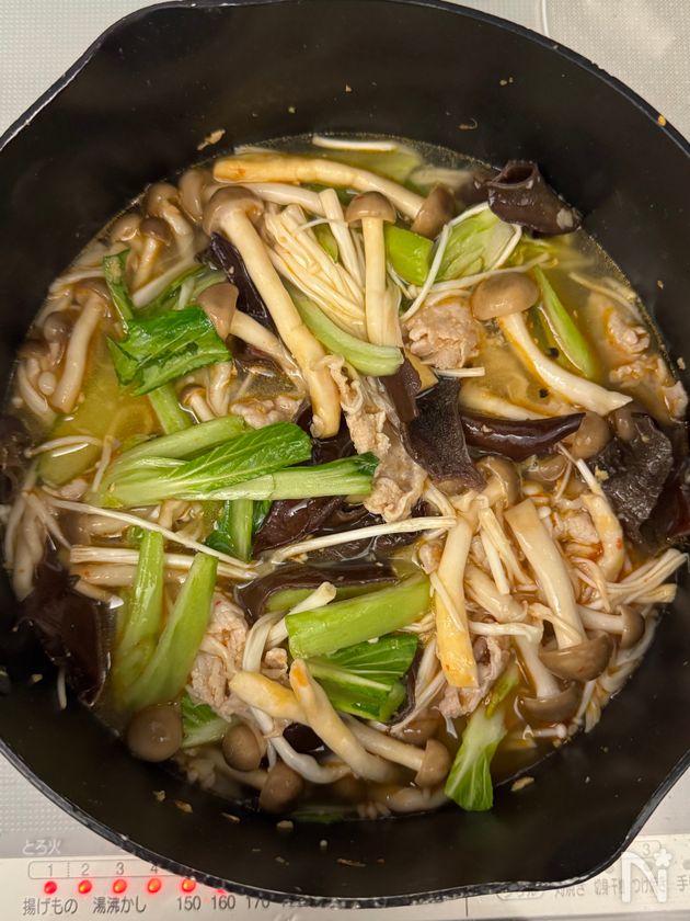 (2) 青梗菜の茎の部分、しめじ、えのき茸、きくらげを入れ、きのこがしんなりするまで、炒める。