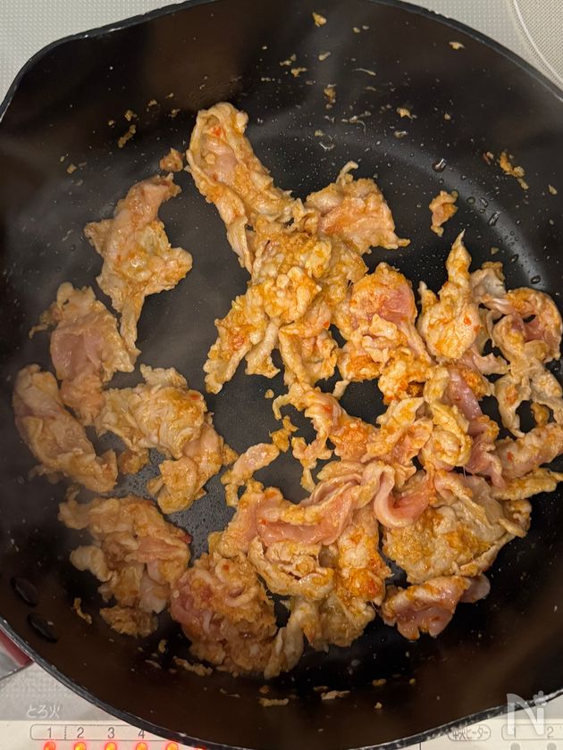 (1) 鍋に、ごま油を引き、にんにく、しょうが(すりおろし)、豆板醤を入れ、香りが出るまで炒めたら、豚こま切れ肉をちぎりながら入れ、色が変わるまで炒める。