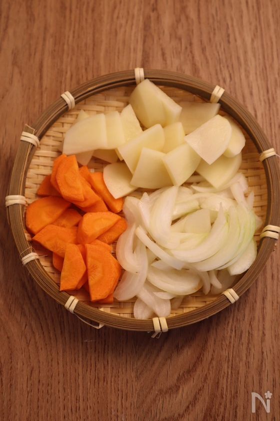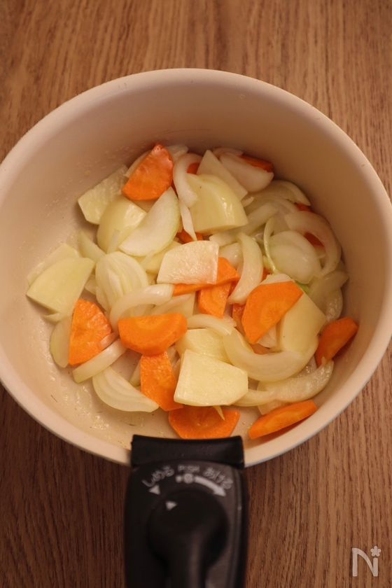 (1) にんじん、玉ねぎ、じゃがいもは火が通りやすいように薄切りにしておく。