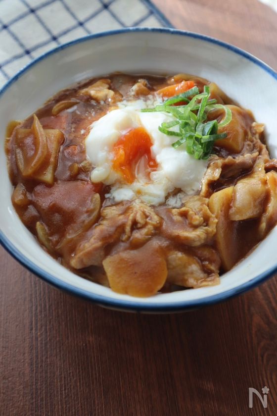 (4) 器にうどんを入れ、③をかけたら、温泉卵と刻みネギをトッピングする。