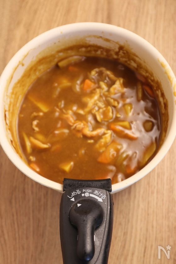 (3) 水を加え沸々としてきたら豚こま肉を加え、色が変わったら弱火にする。【A】を加えてカレールウがしっかり溶けるまで混ぜ合わせる。