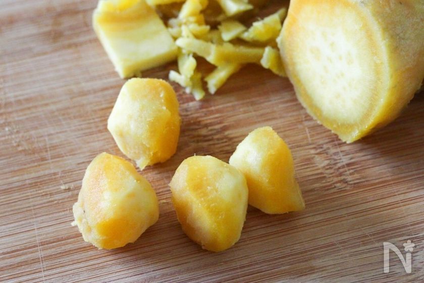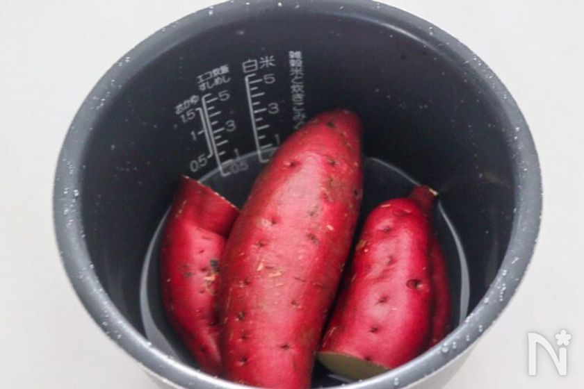 さつまいもが大きい場合、炊飯器に入る大きさに切ってください。