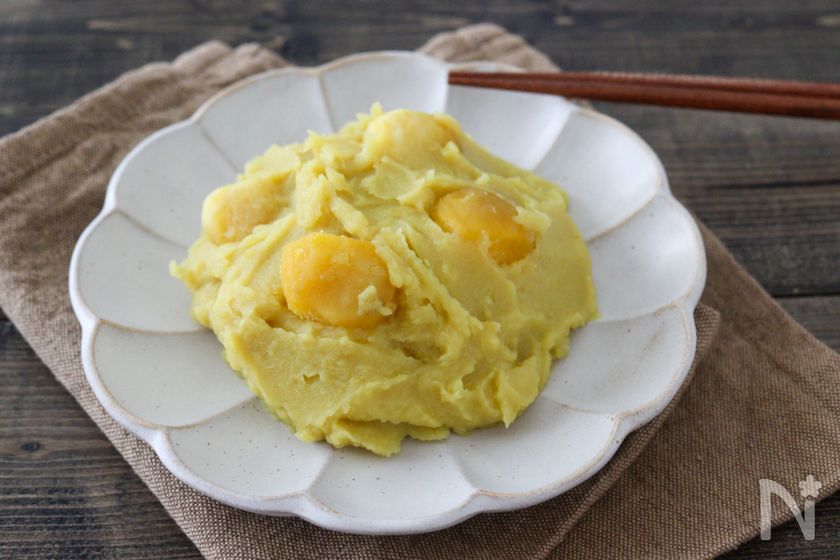 (4) 器に③を盛り、栗の形に切ったさつまいもを飾る。