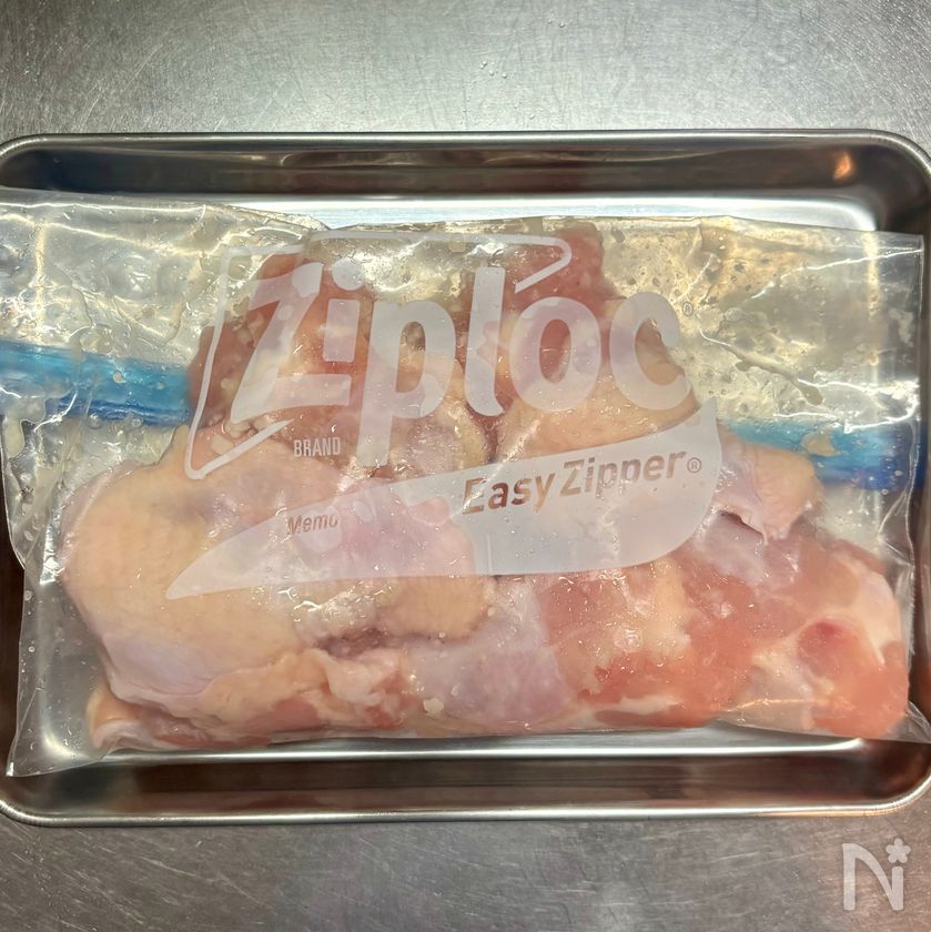 鶏手羽元は塩麹とともにジッパー付き保存袋に入れ、袋の上からもみ込む。