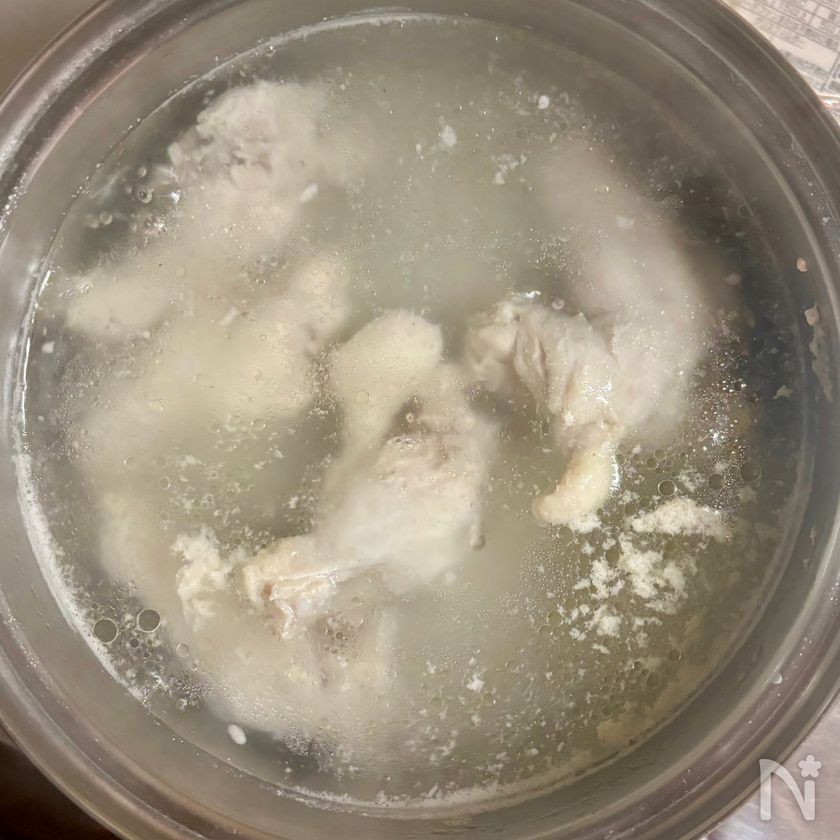 煮立ったらアクを丁寧に除いて弱火にし、鶏手羽元が柔らかくなるまで15〜20分ゆで、鶏手羽元を引き上げる。