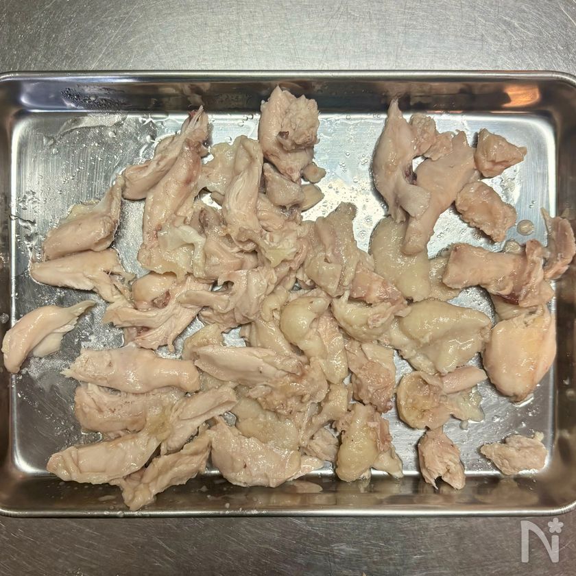 (6) ③の鶏手羽元は粗熱がとれたら骨を除き、肉と皮を1cm大に裂く。