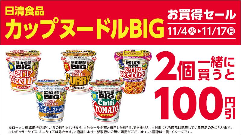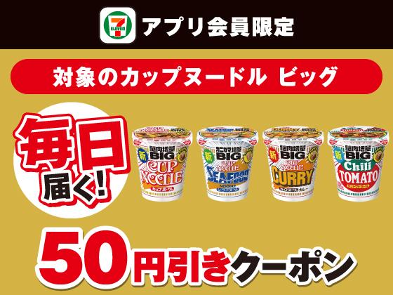 11月3日から16日までの期間、セブン-イレブンアプリ会員限定で、対象のカップヌードル ビッグ50円引きのクーポンが毎日1枚もらえます。