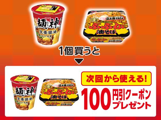 10月30日から11月5日までの期間、対象商品の明星「麺神カップ 生姜醤油味」「ぶぶか 油そば」のどちらか1個を購入すると、対象商品に次回使える100円引きクーポンがもらえます。