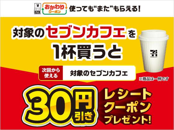 11月4日から10日までの期間、セブンカフェを1杯購入するごとに次回セブンカフェに使える30円引きクーポンがもらえます。