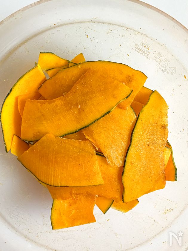 (1) かぼちゃはスライサーで薄切りにし、【A】を絡める。