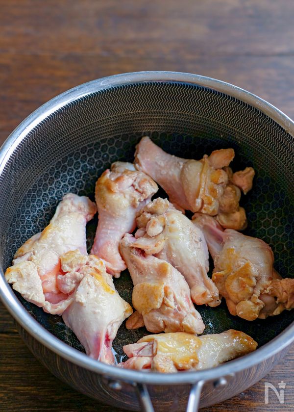 (2) 鍋に米油又はサラダ油を熱し鶏手羽元の表面を中火で焼く。