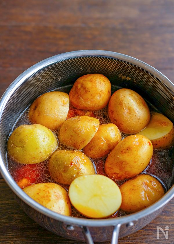 (3) 新じゃがいもと【A】を入れて煮立ってきたら蓋をして弱火~弱めの中火で約20分煮る。