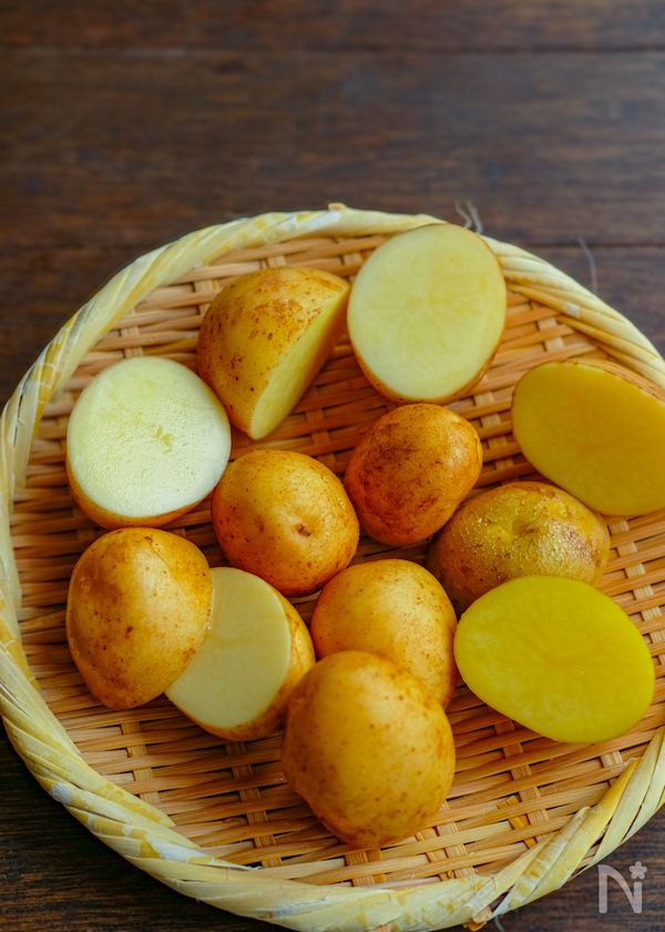 (1) 新じゃがいもはきれいに洗い、皮付きのまま小さめのものはそのまま大き目のものは半分に切る。