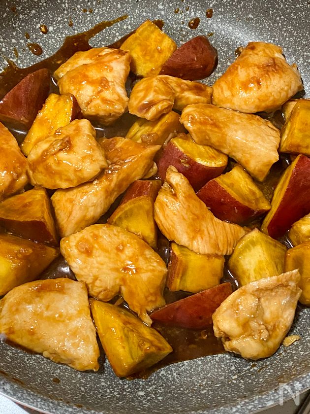 (4) 鶏肉に火が通ったら、さつまいも、合わせた調味料を加えて、全体に絡めながら炒め合わせる。