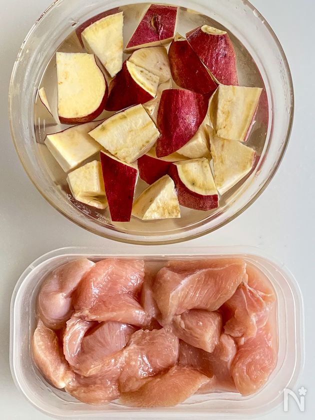 さつまいもは乱切りにし、水にさらす。